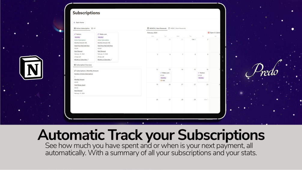 Effortlessly track and manage your subscriptions. For example, see how much you have spent and or when is your next payment, all automatically. With a summary of all your subscriptions and your stats.